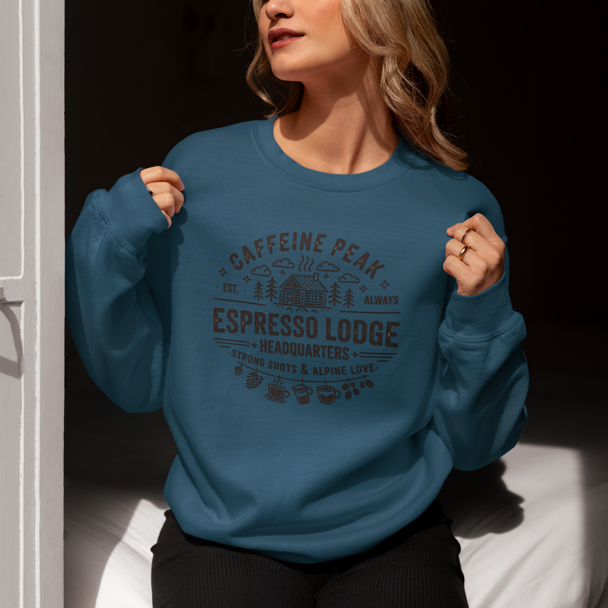 Cozy up in style with our women’s crewneck featuring the bold “Caffeine Peak: Espresso Lodge Headquarters” design. Whether you're sipping a strong shot or dreaming of alpine escapes, this sweatshirt is your go-to for comfort and caffeine-fueled adventure. Perfect for chilly mornings, mountain getaways, or your favorite local café.