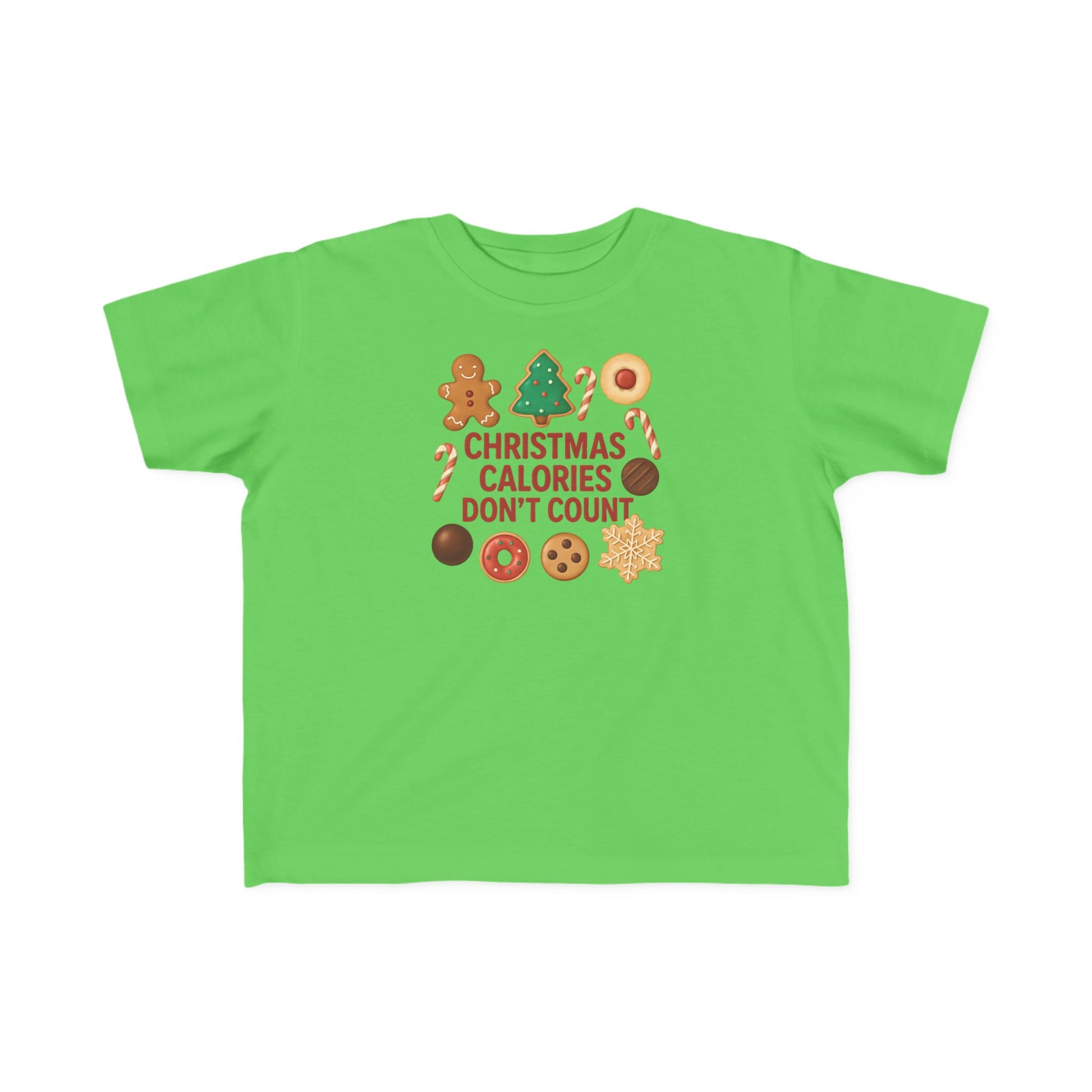 The cheerful illustration of gingerbread, decorated cookies, candy canes, and a tiny Christmas tree surrounds the phrase “Christmas calories don’t count,” making it sweet and silly without being loud. Breathable combed cotton and a gentle classic fit keep toddlers comfy during baking sessions, family photos, or cozy movie nights by the tree. Dress them in this tee for laughter-filled mornings, gingerbread decorating, or cuddles on holiday evenings.
