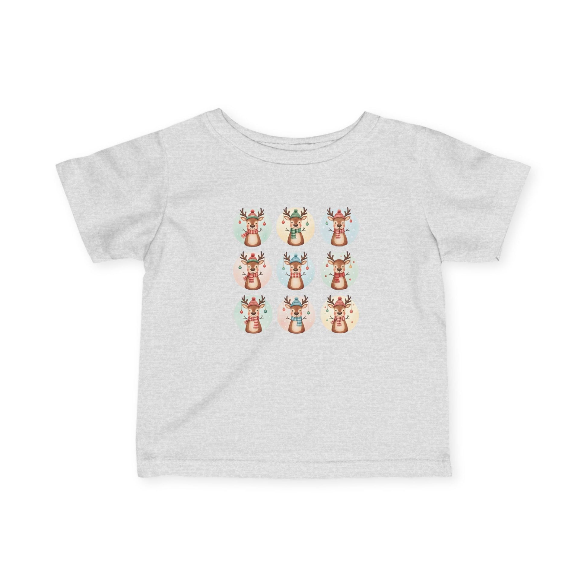 Make the holidays extra merry with this adorable infant t-shirt featuring a group of festive reindeer all bundled up in cozy hats and scarves! Surrounded by snowflakes and Christmas ornaments, this cheerful design captures the joy and warmth of the season. Soft, comfy, and perfect for holiday photos or winter adventures—your little one will shine bright like Rudolph’s nose! 🎄🦌❄️